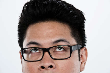 Close up face of young man with glasses and a hat looking at the left top side. Banner with copy space. The concept of choice, vision and searching.