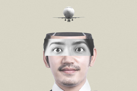 Collage of businessman with composite skin and runway for plane landing on his head. Collage art concept