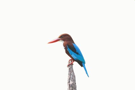 Beautiful Kingfisher blue bird, White-throated Kingfisher (Halcyon smyrnensis), standing on a branch, isolated on white background