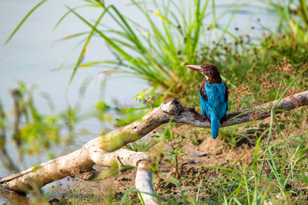 White-throated Kingfisher s a bright blue back, wings and tail. Its head, shoulders, flanks and lower belly are chestnut, and the throat and breast are white.