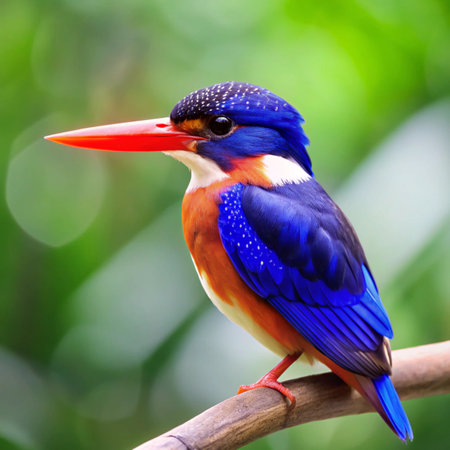 A rare Sulawesi Dwarf Kingfisher (Ceyx fallax) rests quietly on a branch in the lush tropical rainforest of Sulawesi, Indonesia. This small and vibrantly colored kingfisher species is endemic to Sulawesi and is known for its elusive behavior and striking red bill and blue crown.