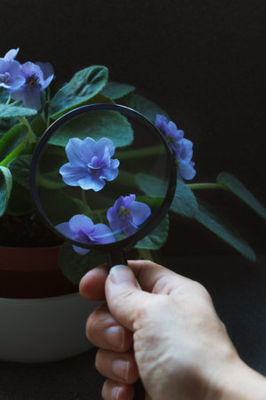 Hand holding magnifier. Gerdening Santpaulia at home, plants desease detecting