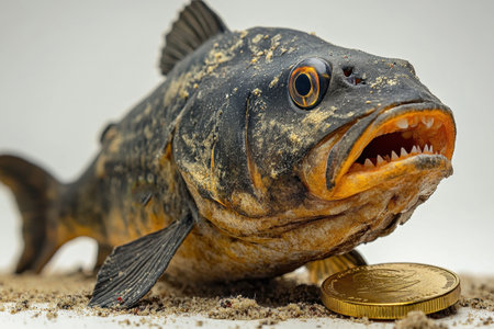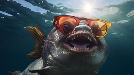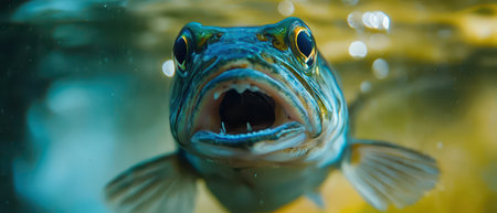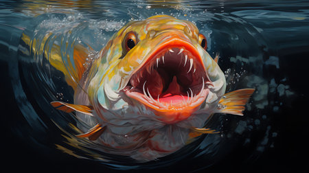 a fish swimming on the water's surface, showcasing a realistic hyper-detailed rendering. this photo captures the precisionism influence with a tilt-shift effect, highlighting the fish's strong facial expression. the use of photo-realistic techniques brings out the intricate details, while the detailed background elements add to the realistic portrayal. ai generated
