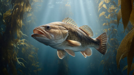 A stunning view of a largemouth bass gliding through underwater kelp. The peaceful scene captures vibrant marine life, softened by gentle sunlight beams penetrating the surface.