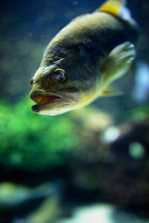 close up view highlights the unique anatomy and vibrant coloration of the Micropterus salmoides commonly known as bass. This species is exhibited in detail emphasizing its allure.