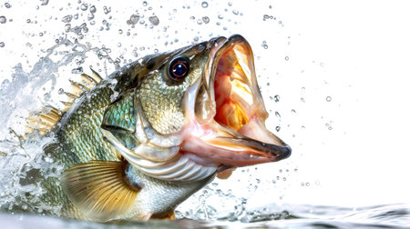 A large river bass leaps into the air, mouth open wide, creating splashes of water against a pristine white backdrop, showing the beauty of nature's actions.