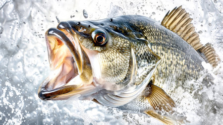 An angry river bass bursts out of the water, splashing dramatically against a bright backdrop, showing its powerful jaws and vibrant scales.