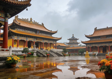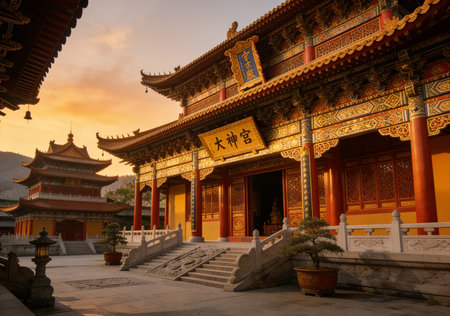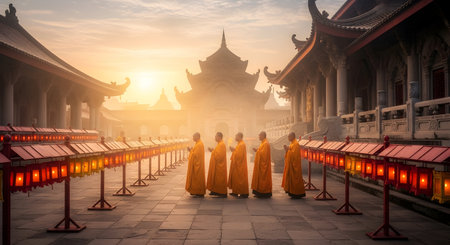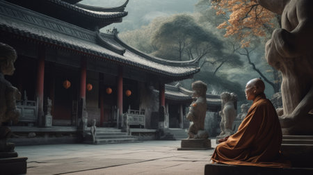 A monk meditating in front of a chinese temple. Generative AI