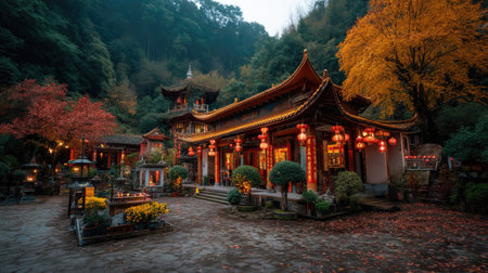A serene autumn view of a traditional Asian temple nestled in nature, adorned with vibrant foliage and glowing lanterns, creating a peaceful ambiance.