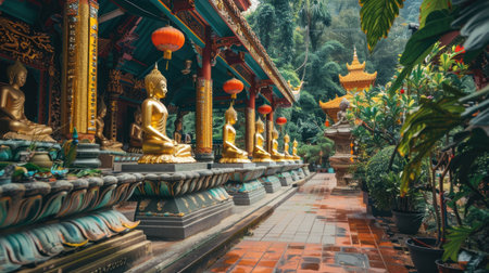 Explore a serene temple pathway lined with golden Buddha statues, surrounded by lush greenery. This scenic view captures the essence of tranquility and spirituality.