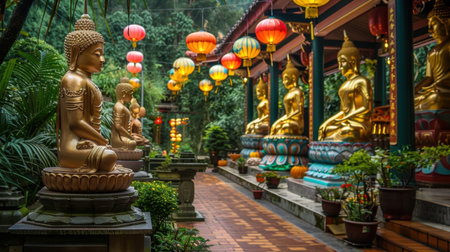 Discover a tranquil garden featuring golden Buddha statues surrounded by lush greenery and vibrant lanterns, creating a serene atmosphere for meditation and reflection.