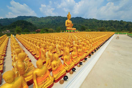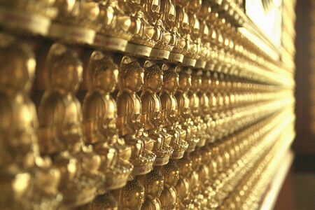 Golden buddha statue lined up along the wall, Phra Maha Chedi Chai Mongkol Temple, Roi Et Thailand