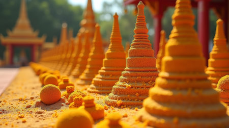 Golden sand stupas arranged outdoors for buddhist festival with intricate decorations.