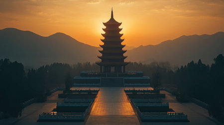 A breathtaking sunset highlights a traditional pagoda set against majestic mountains, offering a peaceful and enchanting atmosphere perfect for travel enthusiasts and nature lovers.
