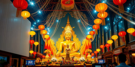 A captivating view of a breathtaking Buddha statue in a beautifully decorated temple. Colorful lanterns enhance the tranquil atmosphere, inviting reflection and devotion.