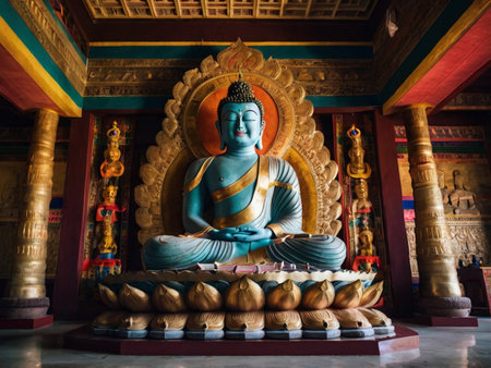 A stunning Buddha statue sits gracefully in an ornate temple, surrounded by intricate decorations and architectural beauty, evoking spirituality and tranquility.
