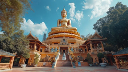 A serene temple scene featuring a majestic Buddha statue surrounded by lush landscapes and vibrant architecture, ideal for travel and cultural themes.