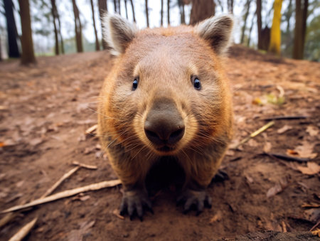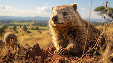 AI Generated. Serene Wombat Relaxing in Burrow Entrance Bathed in Soft Sunlight - Cozy Wildlife Scene