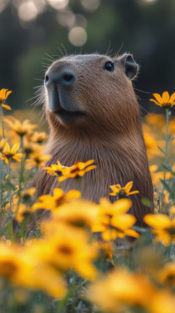 This capybara lounges peacefully in a field filled with bright yellow flowers, basking in the warmth of a sunny day, surrounded by natures beauty and tranquility.