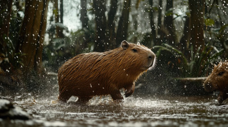 A capybara wanders through shallow water in a lush jungle setting, captivating the viewer with its unique form and tranquil environment amidst raindrops.
