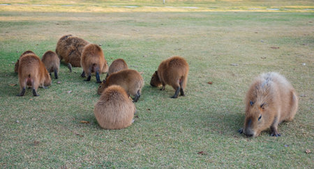 family of capybaras, Hydrochoerus hydrochaeris, feeding on grass.