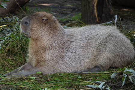 The largest rodent, the capybara, lies on the green grass. The capybara squints against the sun. Relax. Close-up portrait of an animal
