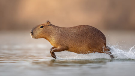 A capybara elegantly runs through water, creating splashes that highlight its agility. This serene moment captures the beauty of wildlife in its natural environment.