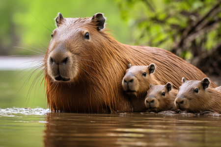 Capybara (Hydrochoerus hydrochaeris) mother with her three babies, A capybara family resting together on the banks of a river, AI Generated