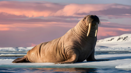 a large walrus rests on an ice floe under a colorful sky in the arctic ocean environment today