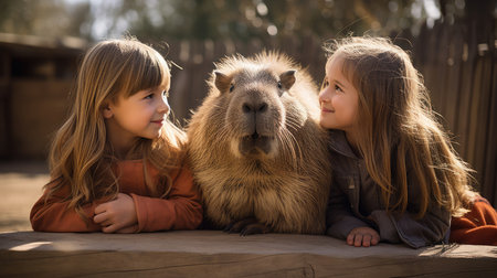 Children interact with a capybara at a petting zoo.
