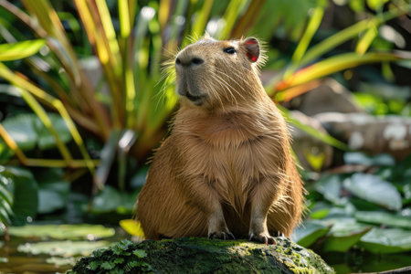 A capybara stands gracefully near a serene pond amidst lush tropical foliage. This tranquil scene highlights the beauty of wildlife in its natural habitat, showcasing the vibrant greenery and calm water. Perfect for nature lovers and wildlife enthusiasts.