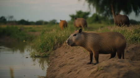 two capybaras, rendered in cinema4d, stand in the water near a lake. the warm color palettes and captivating visual storytelling make this scene truly beautiful. with rtx on, the eye-catching nature-inspired details come to life, creating a mesmerizing image. ai generated