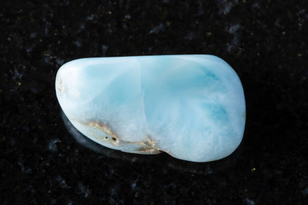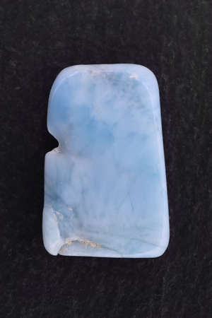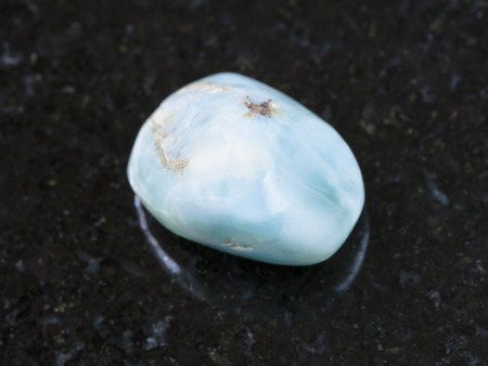 macro shooting of natural mineral rock specimen - tumbled Larimar gem stone on dark granite background from Dominican Republic
