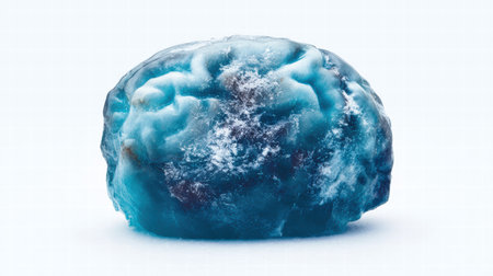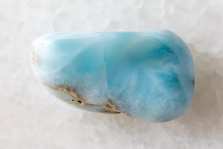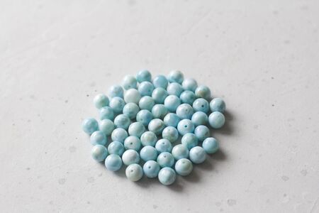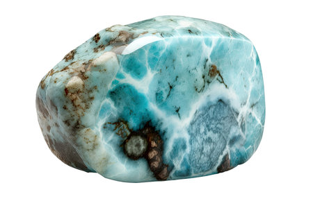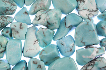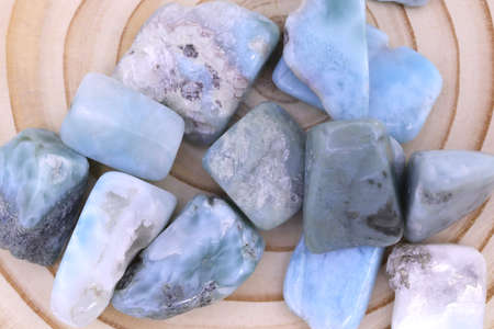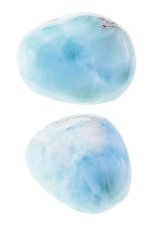 macro photography of natural mineral from geological collection - tumbled larimar (stefilia stone) gem on white background
