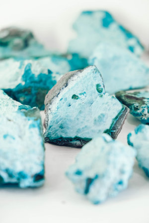 Chrysocolla stones on a white background. Copy, empty space for text.