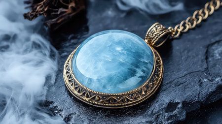 This stunning aquamarine pendant features a gorgeous blue gemstone set in an intricate gold frame, resting on a sleek dark slate background. Perfect for showcasing elegance.