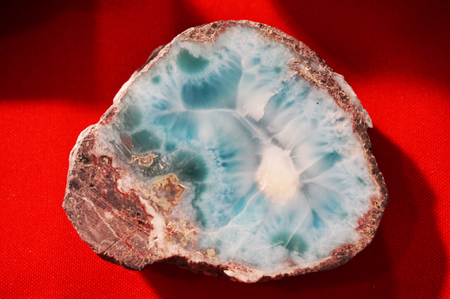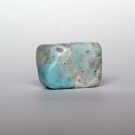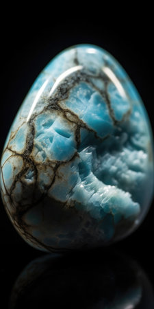 Larimar, also called Stefilia's Stone, is a rare blue variety of the silicate mineral pectolite found only in the Dominican Republic, an egg shaped on a white background.