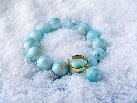 Luxury elegant blue larimar stone bracelet and pendant on white snow background. Close-up shot