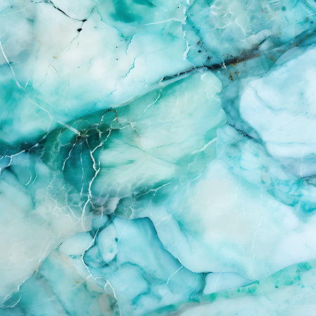 High-resolution close-up showcases an abstract marble texture in shades of blue-green, accented with intricate veins, swirls, and sporadic cracks creating depth and visual interest.