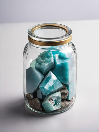 glass jar with different minerals on table against grey background