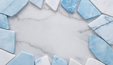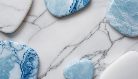 Blue and white stones on white marble background, top view, copy space