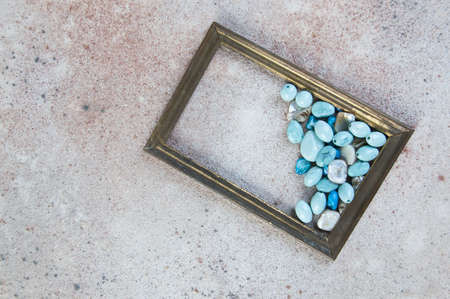 Antique brass empty picture frame and beads on concrete background. Photography props and copy space for text.