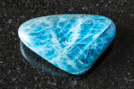 sample of tumbled apatite rock on black granite background close up from Brazil