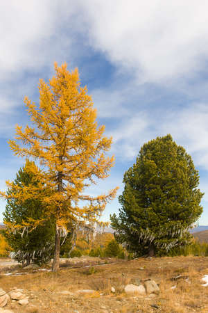 Nature of the Altai mountains in autumn with snowy mountain peaks on the horizon, autumn taiga and yellow larch trees. Russia