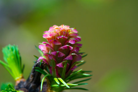 the stunning beauty of bright pink larch cones in spring. Take a moment to appreciate the wonders of nature. Capture a rare view of nature's beauty in full bloom.