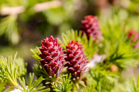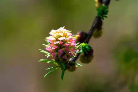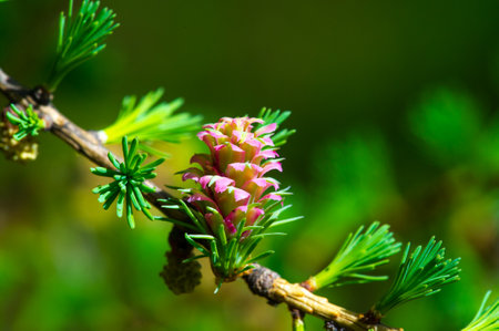 bright pink larch cones in spring. Connect with nature and appreciate the wonders of the natural world. Celebrate the arrival of spring with a stunning display of pine trees in bloom.