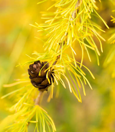 Yellow larch tree with small cone in autumn. Macro image, shallow depth of field. Nature background