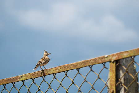 Crested lark (Galerida cristata) sitting on a concrete fence on sky background.