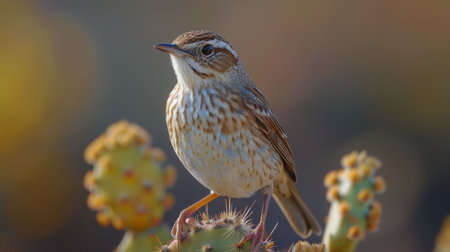 A small bird is standing atop a cactus, balancing itself on the prickly surface. The birds colorful feathers contrast with the green of the cactus, creating a striking visual.