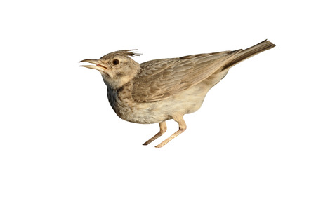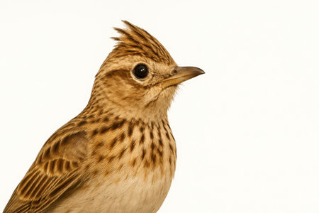 Japanese skylark head and chest portrait on white background three quarter view with bright eye and crest forward for bird and nature themes